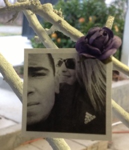 I thought I’d hang black and white photos of the couple from birth until now on branches that I’ve painted white. I picked up some plain wooden 1″ clothespins at Hobby Lobby that I sprayed with a light coat of silver spray paint and some little paper flowers at my local flea market.