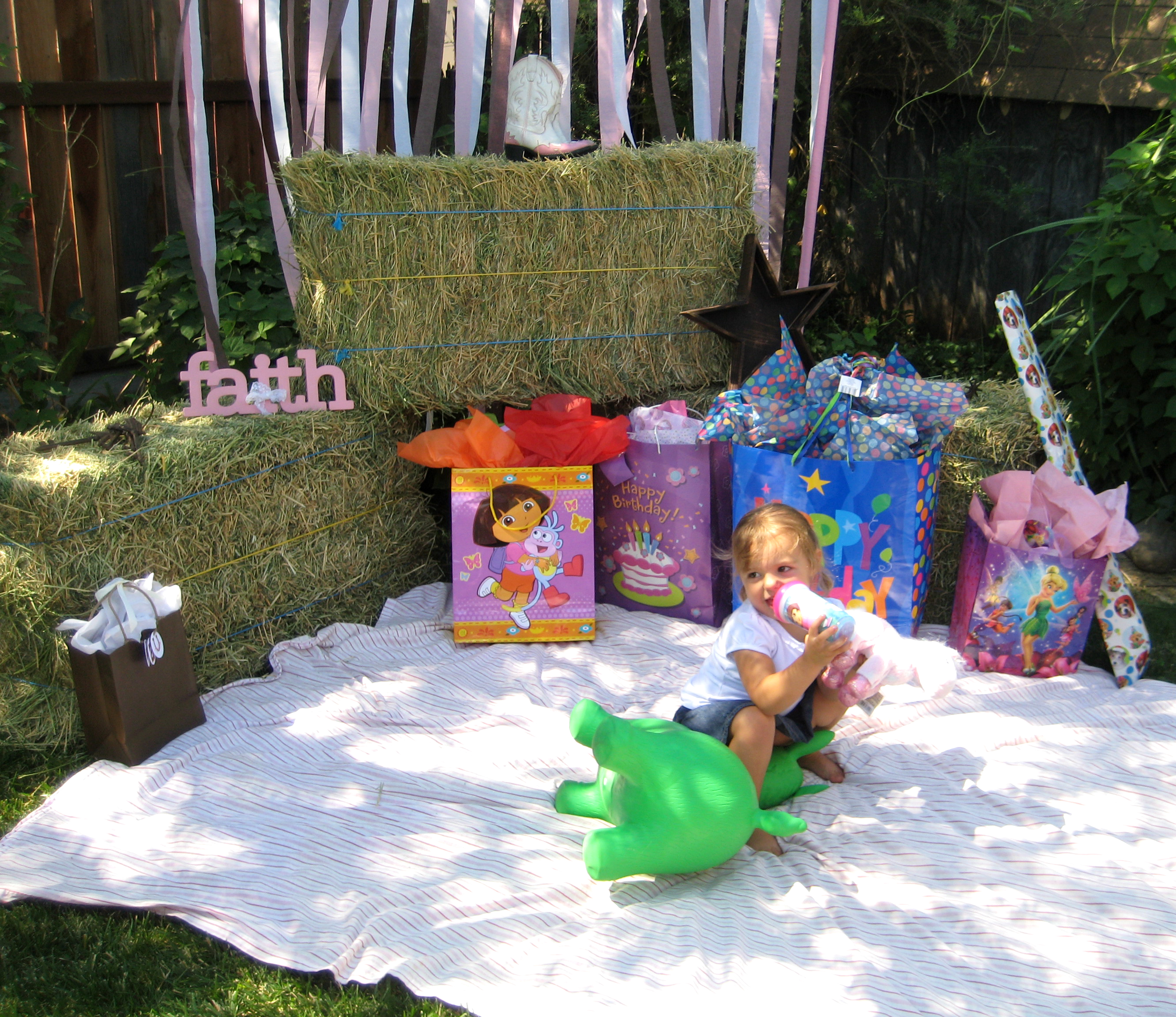 I wanted to create a little area for her to be able to play and open her presents. I stacked three hay bales with a streamer backdrop and added a few country accessories. I put a sheet down for comfort, and she loved it. She was the queen in her special area.