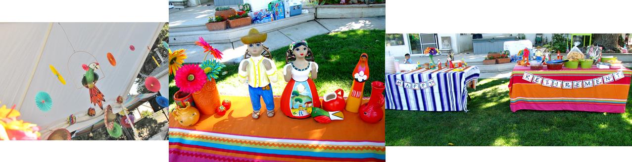 3. General Decorations: This party was held at my parents house, in their very lovely and lush backyard. It has beautiful trees and a glistening pool so that really added to the decor. To make it a real fiesta, I gathered little trinkets and knick knacks I had around my house, my parents house and anywhere I could think of. Many of the decorations are from Mexico gathered from various trips taken to Mexico to visit family. It’s definitely a PLUS having family in Mexico 🙂 Aside from cultural souvenirs, Ranai made her awesome paper medallions that helped bring color to the eating area. That little parrot hanging out there is my mother’s from a trip of hers to Puerto Vallarta…sure came in handy! We used a Mexican blanket and a duvet cover for table cloths, along with a Happy Retirement banner to set up the food staging area.