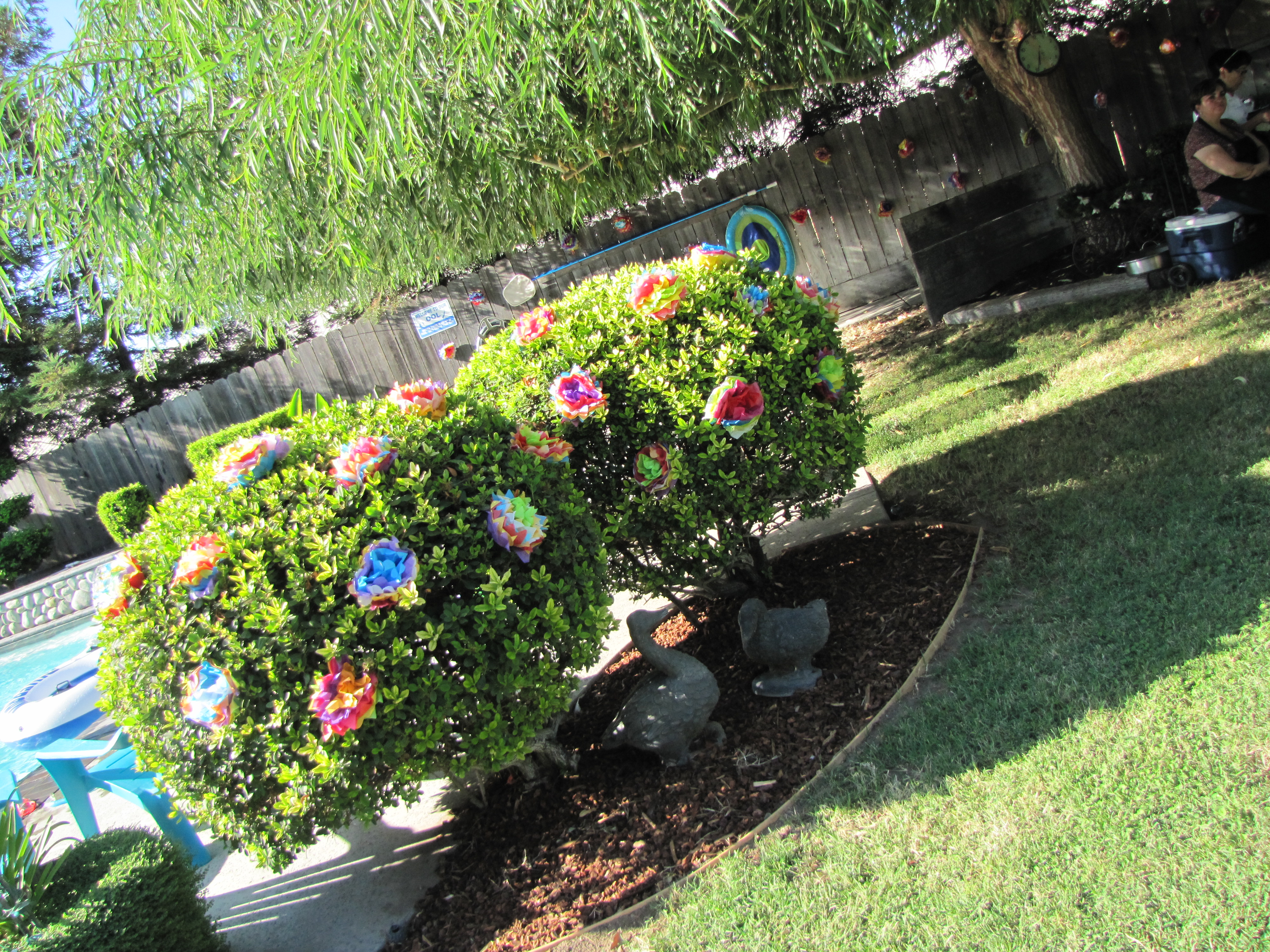 4. Paper flowers: These are simple decorations that, though they take a little bit of time, add a LOT to the scene. I used this paper tutorial to get the shape of the flowers i wanted and just went from there. I bought stacks of tissue paper and gave my 3 sisters and my mom some work to do! We started months in advance and ended up with hundreds of flowers that added a special feel to the yard. Fake flowers=fun flowers!