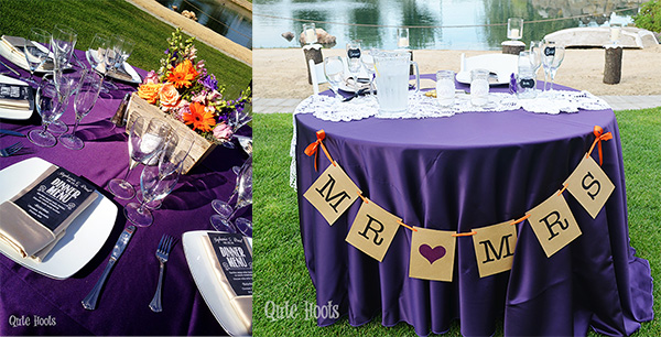 We added a few special items for the Sweetheart Table. I made the Mr. and Mrs. banner with Kraft paper and Stephanie’s mom sewed together lace doilies for a table runner. We moved the logs and candles behind the table for a beautiful nighttime sparkle.